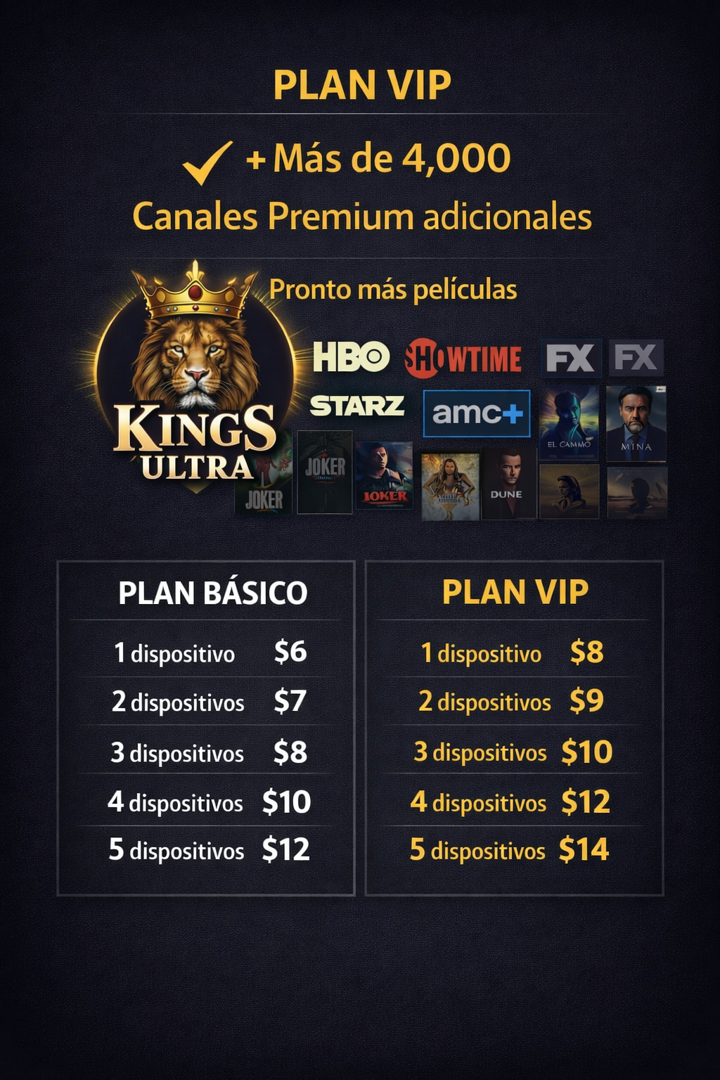 3,900 canales, 46,800 peliculas, 4,800 series. ¡No te quedes afuera! Únete hoy y empieza a disfrutar de Kings Ultra.