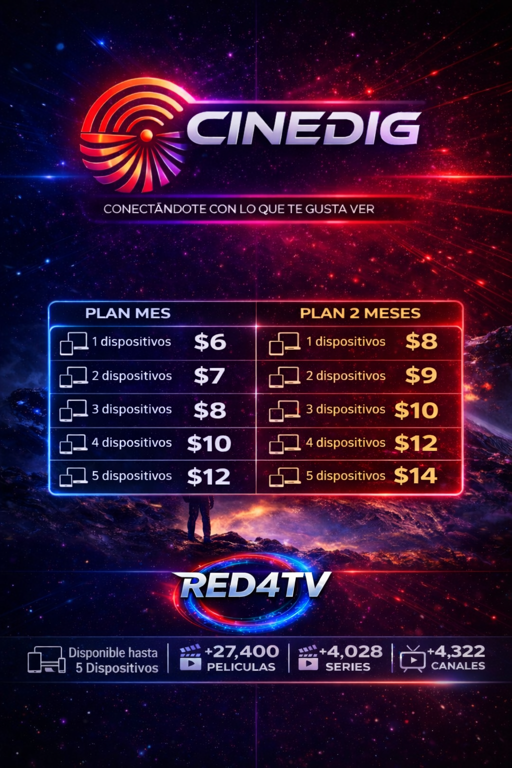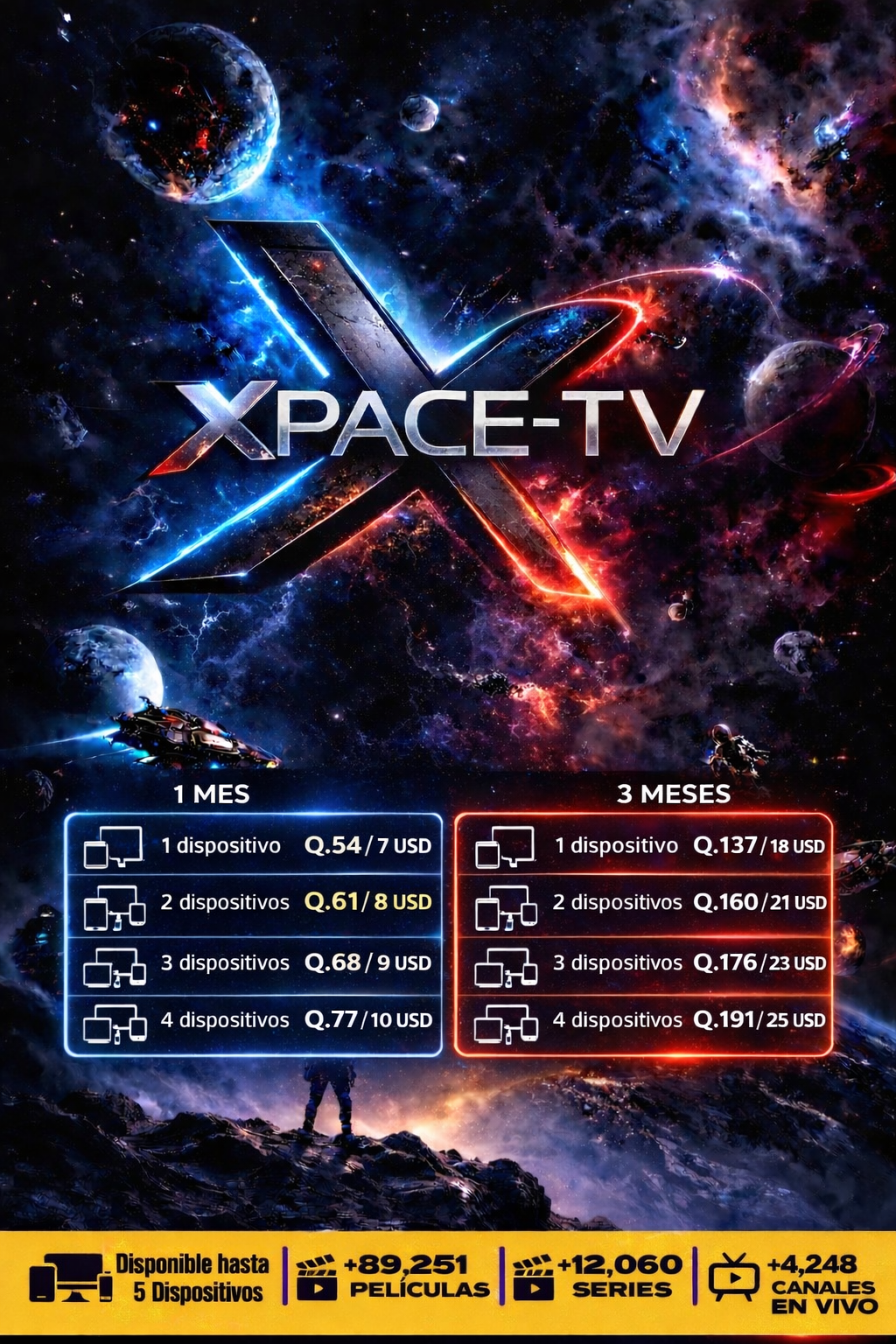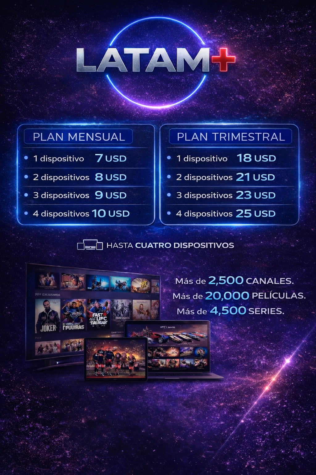 2,500 canales, 20,000 película, 4,500 series. C/d nuevo contenido, soporte de 9 am, a 7pm